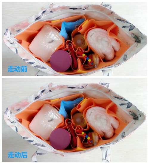 走動(dòng)前各類(lèi)物品排放很整齊,但是經(jīng)走動(dòng)后,物品雜亂無(wú)章。可能會(huì)出現(xiàn)奶瓶漏水等情況,且這樣無(wú)法保證紙尿褲和紙巾的衛(wèi)生。